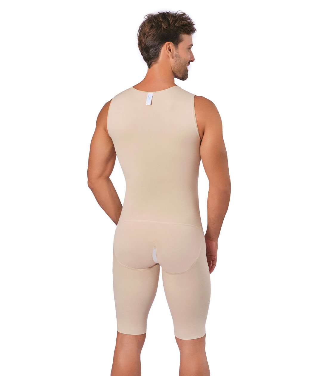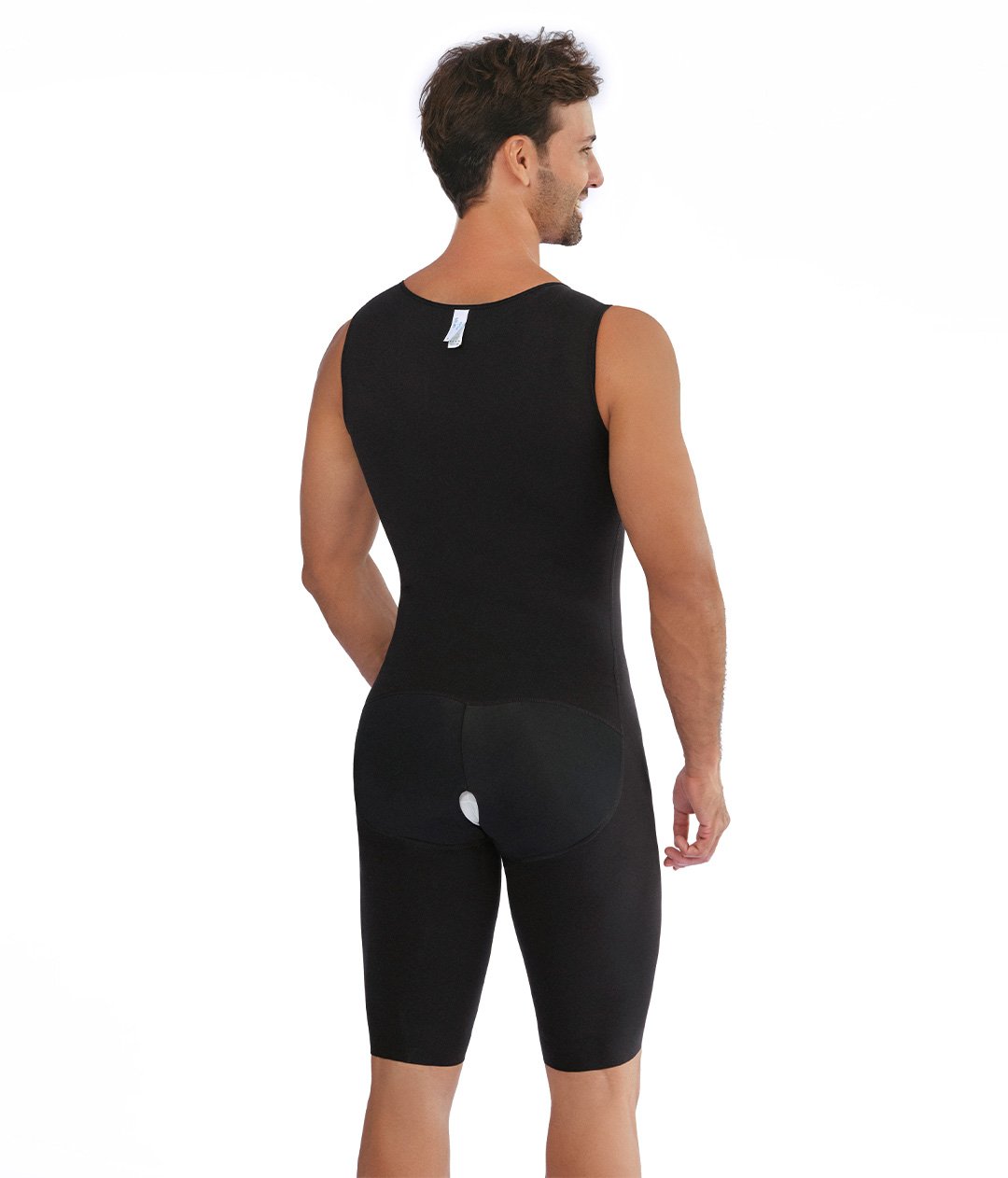 Enterizo masculino completo con abrochadura central de 3 posiciones y orificio perineal diseñado para liposucciones y ginecomastias.